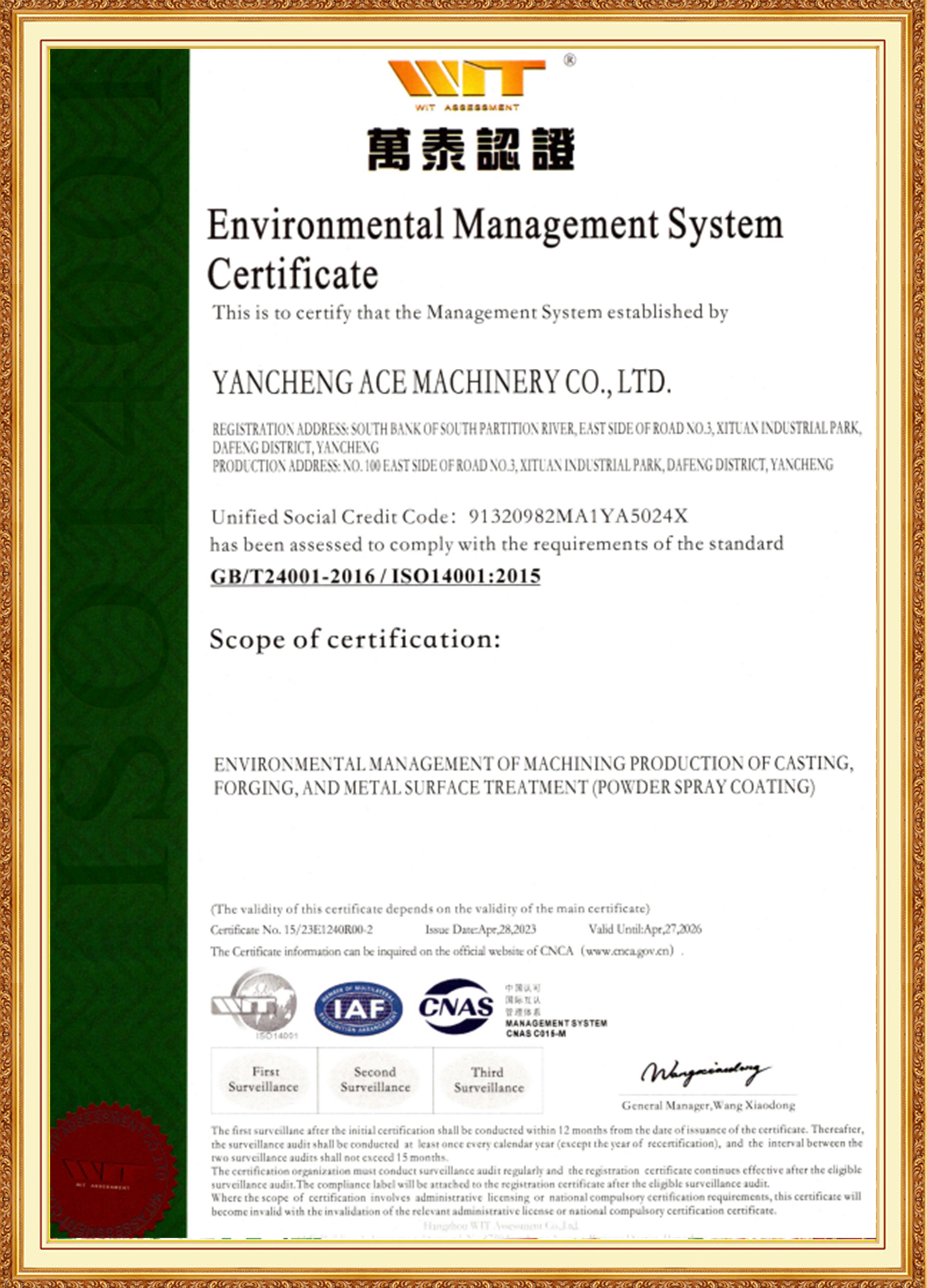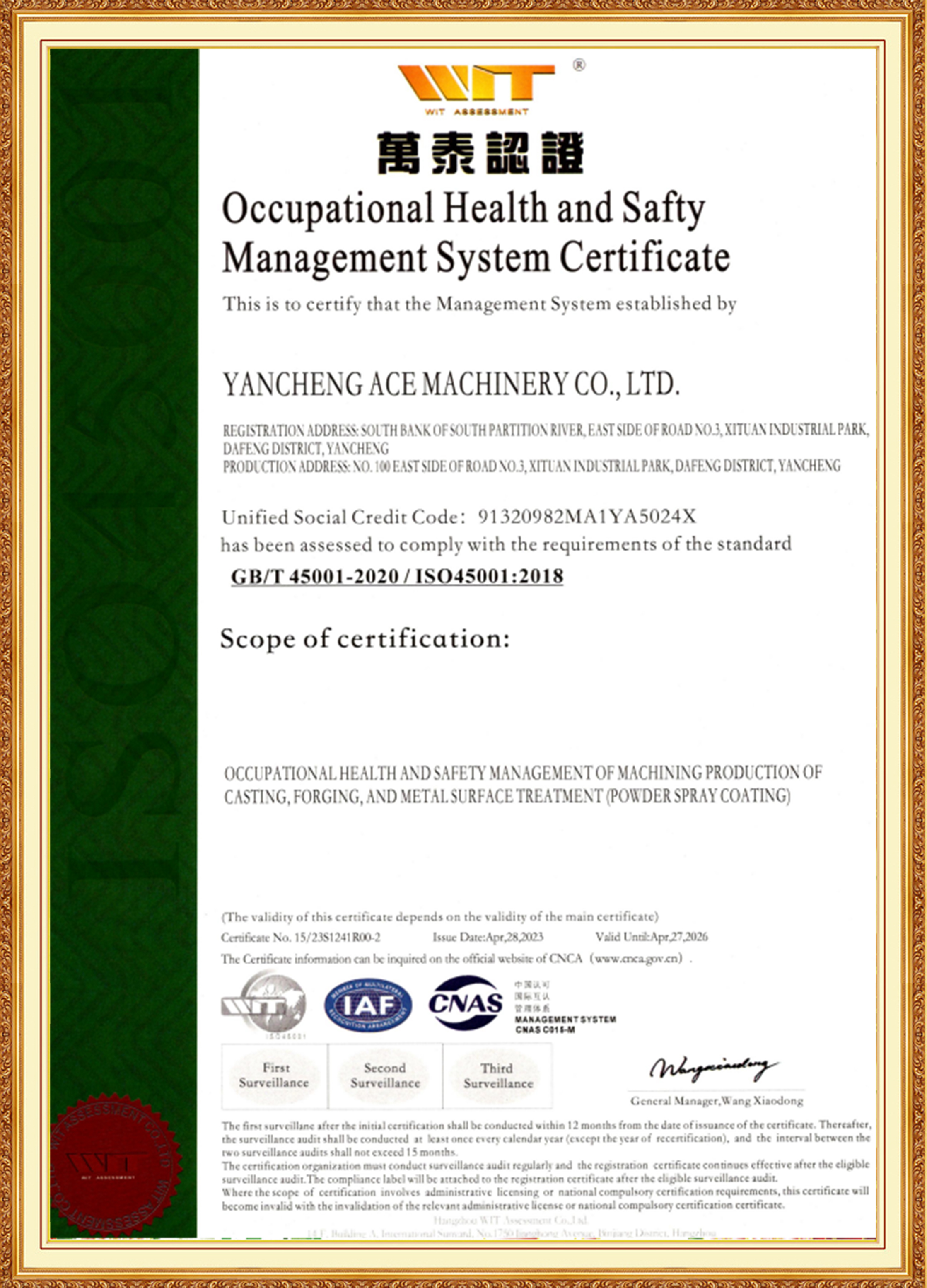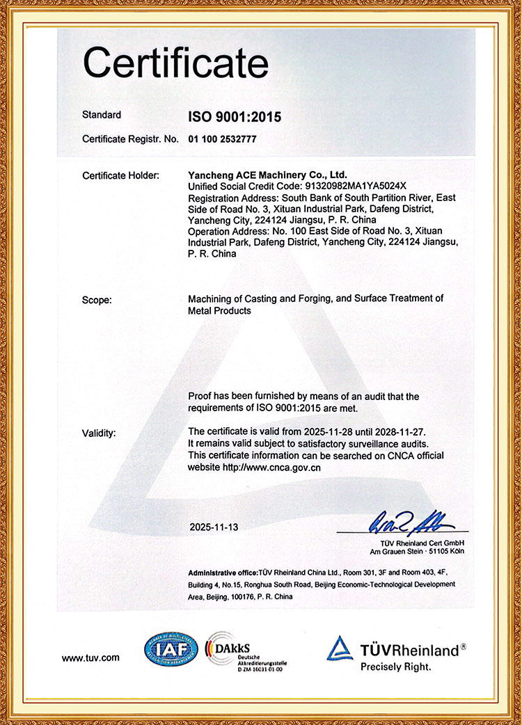 گروه ACE توسط یک تیم مدیریتی متشکل از اعضای کلیدی جوان که در صنایع مواد، عملیات حرارتی، ماشینکاری و تصفیه سطح تجربه دارند، پشتیبانی میشود. آنها به استانداردهای بین المللی و داخلی مسلط هستند، پیشگام و متعهد به نوآوری هستند. شرکت تابعه ACE Machinery دارای گواهینامه سیستم مدیریت کیفیت ISO 9001 TÜV Rheinland و همچنین گواهینامه های سیستم ISO 14001، 45001 و 50001 است. این شرکت به عنوان یک شرکت تخصصی، تصفیه شده، منحصر به فرد و نوآور، یک شرکت ملی فناوری پیشرفته شناخته شده است و دارای رتبه اعتباری سازمانی در سطح 3A است.
