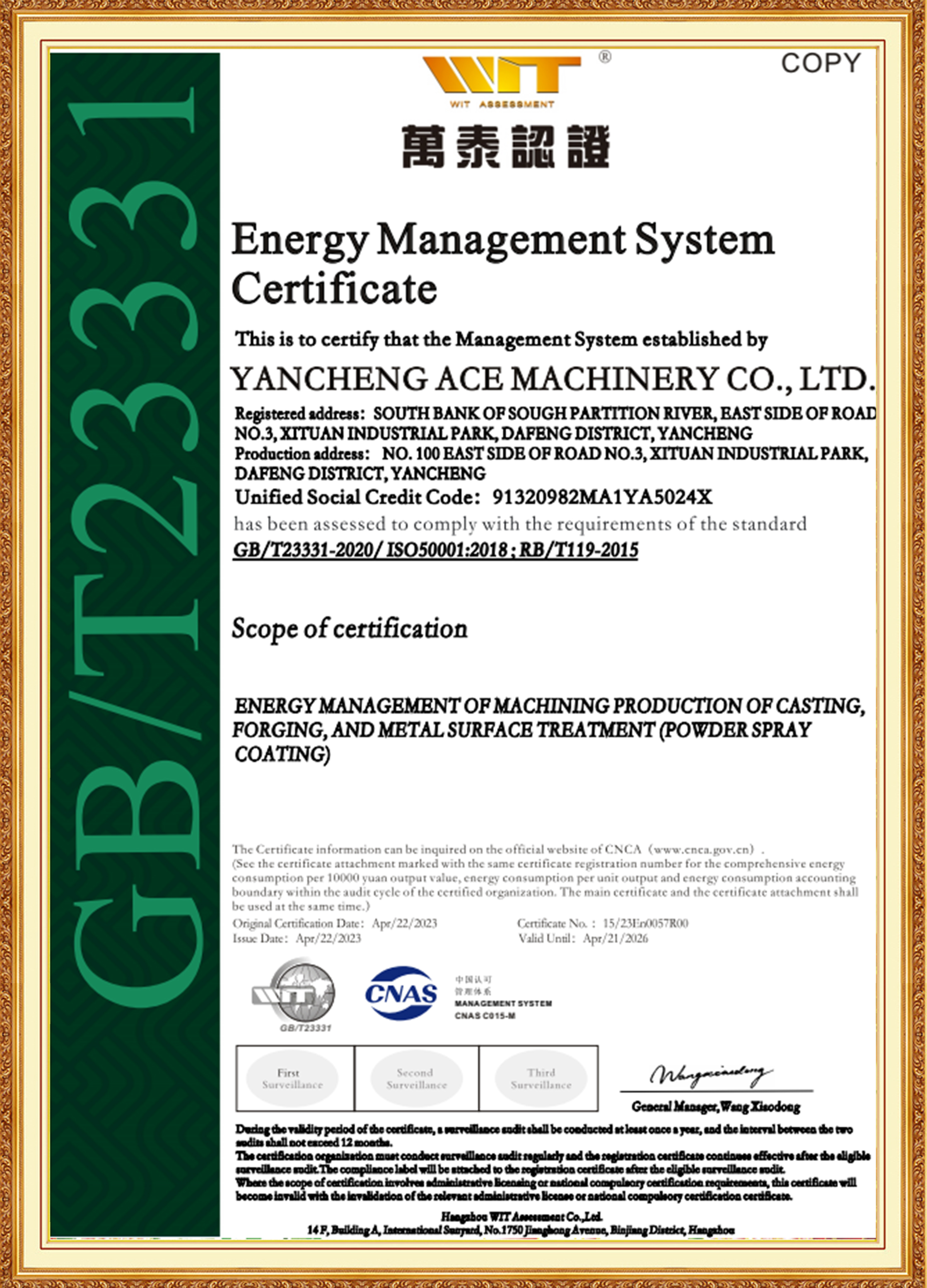 Jiangsu ACE Energy Technology Co., Ltd.: پایگاه اصلی تولید این گروه، به طور رسمی در نوامبر 2025 شروع به کار کرد. 55 هکتار با مساحت کل بیش از 50018 متر مربع را اشغال می کند. این کارخانه مجهز به چکش های الکترو هیدرولیک 3 تنی، 5 تنی و 15 تنی است. دستگاه های نورد حلقه عمودی 1 متری و 1.5 متری; کوره های گرمایش گاز طبیعی کم مصرف؛ کوره های مقاوم در برابر عملیات حرارتی؛ تانک های خاموش کننده؛ تجهیزات سخت کاری القایی؛ مراکز ماشینکاری؛ و سایر تجهیزات تولیدی